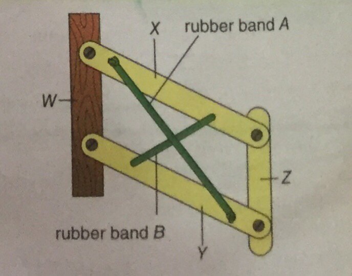 1) Apabila gelang getah A memanjang, gelang getah B akan mengendur, menyebabkan X dan Y untuk bergerak ke bawah.
